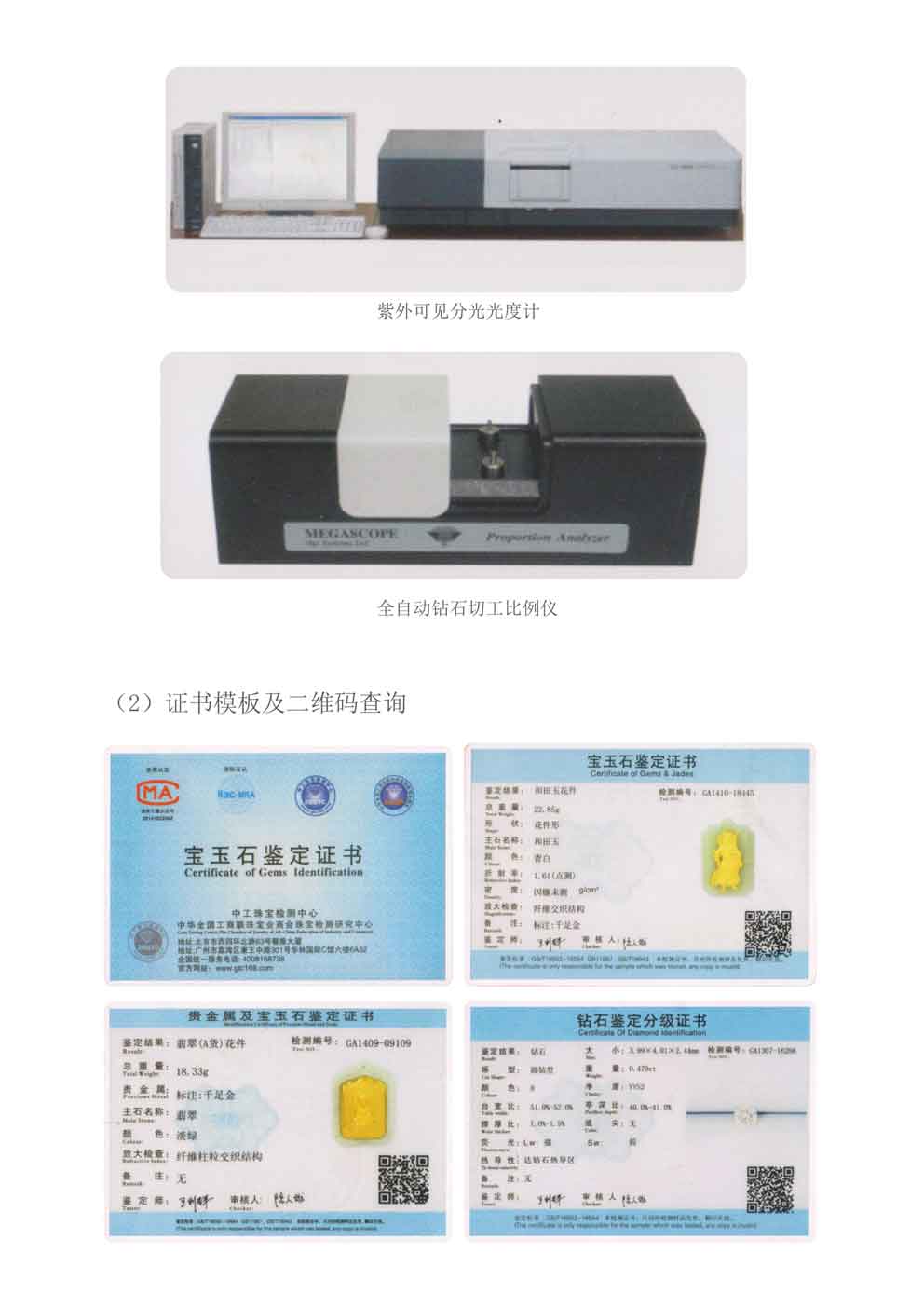 本中心拥有几十套珠宝玉石鉴定仪器及多台傅立叶变换红外光谱仪、全自动钻石切工比例仪、紫外可见分光光度计及X-3680x射线荧光光谱分析仪、GEM-3000珠宝检测仪等大型仪器设备。业务服务项目:宝玉石检测、钻石鉴定与分级、贵金属检测等。